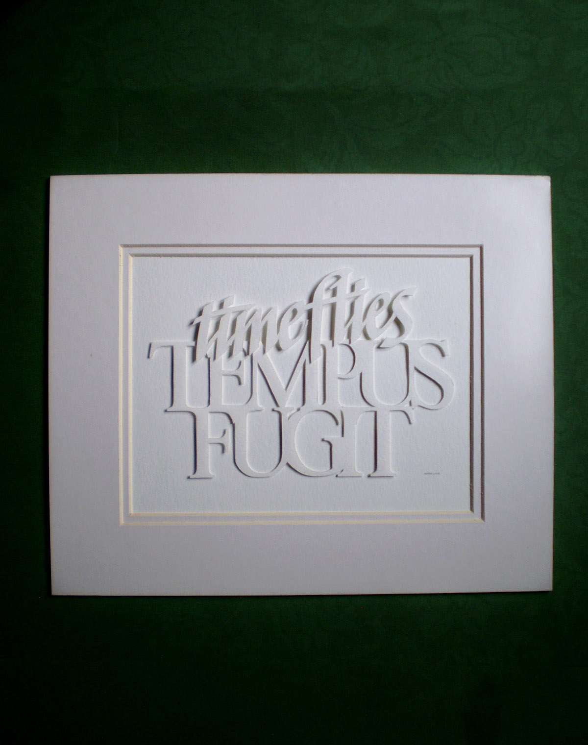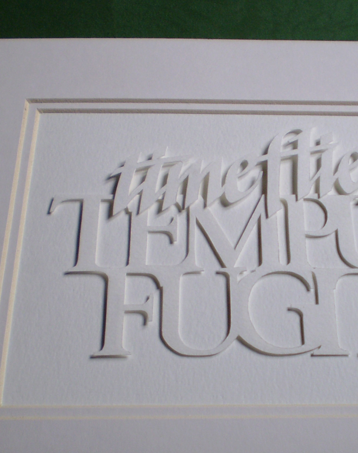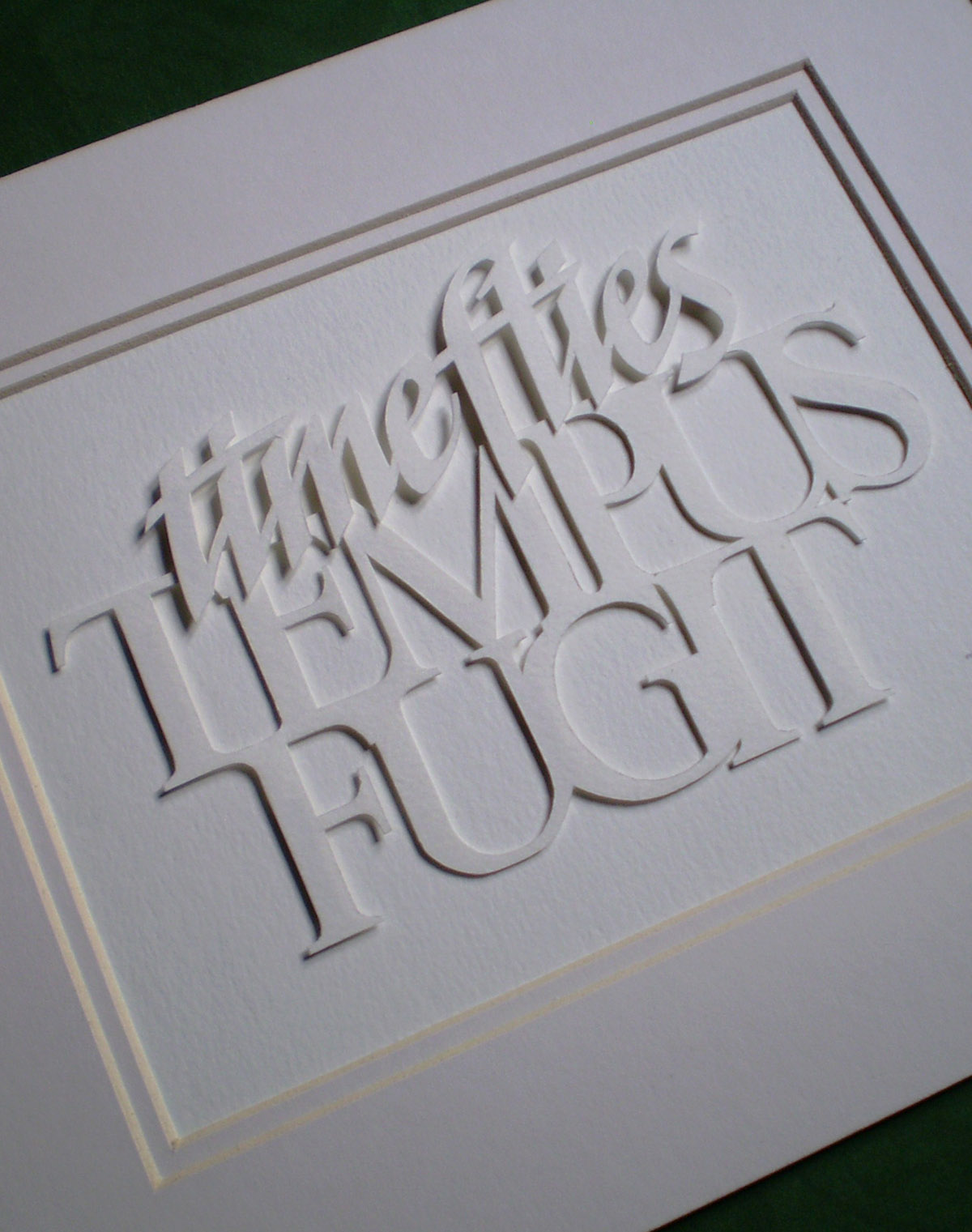 White on white. The latin Tempus Fugit was written in Roman capitals and the translation in a cursive italic. It was important to securely link each letter to the next so that the whole design could be carefully cut out in one piece and stuck to a base board to create a three-dimensional image.