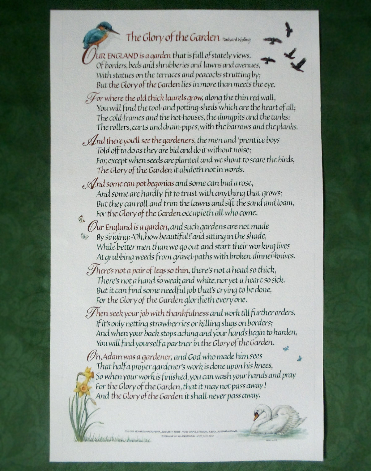 This classic poem by Rudyard Kipling was a gift to a mother who was extremely fond of her garden and very proud to have a kingfisher as a regular visitor.